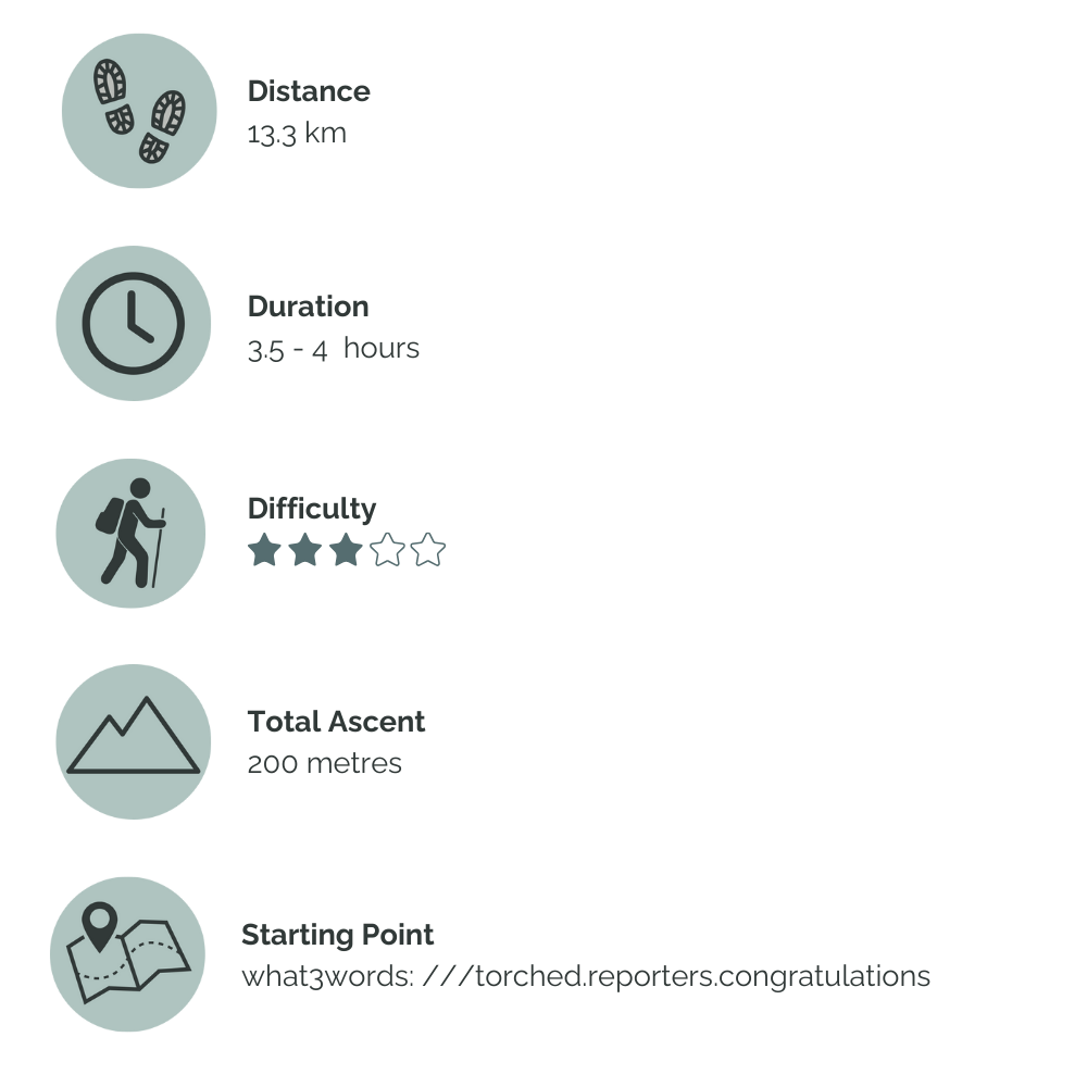 Around 4 hours, but this depends on pace and how many stops you make to explore historic sites or take in the views. Use my hiking time calculator to find out how long it might take, depending on the distance and ascent.
